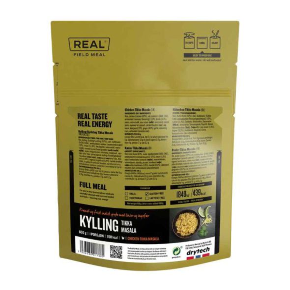 Descripción: Un gran clásico de la cocina liofilizada es el pollo al curry. Real Turmat ofrece pollo con arroz, verduras variadas y curry.